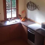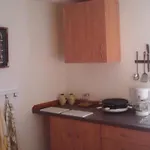 Het appartement heeft een kitchenette ingericht met een koelkast en keukengerei.
